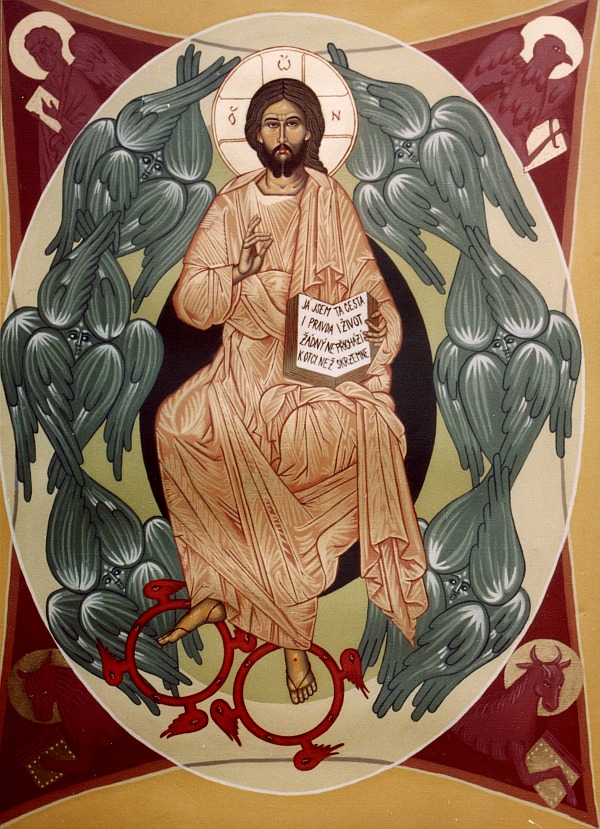 Spasitel na trůnu uprostřed nebeských mocností andělských
